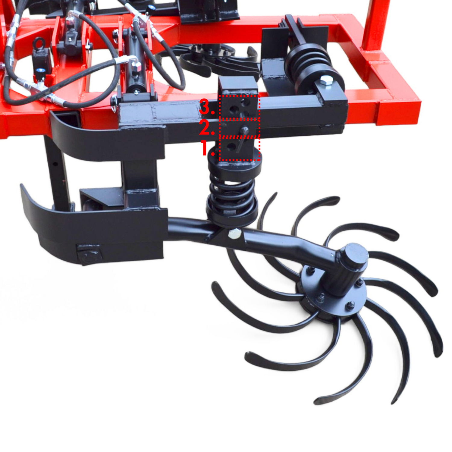 - A középső furatokat (normál beállítás) érdemes általános esetben használni. Ebben az állásban hatol bele a forgókapa feje megfelelően a talajba, illetve biztosított a jobb oldalirányú mozgás, ezzel a gyökérzóna hatékony elkerülése.