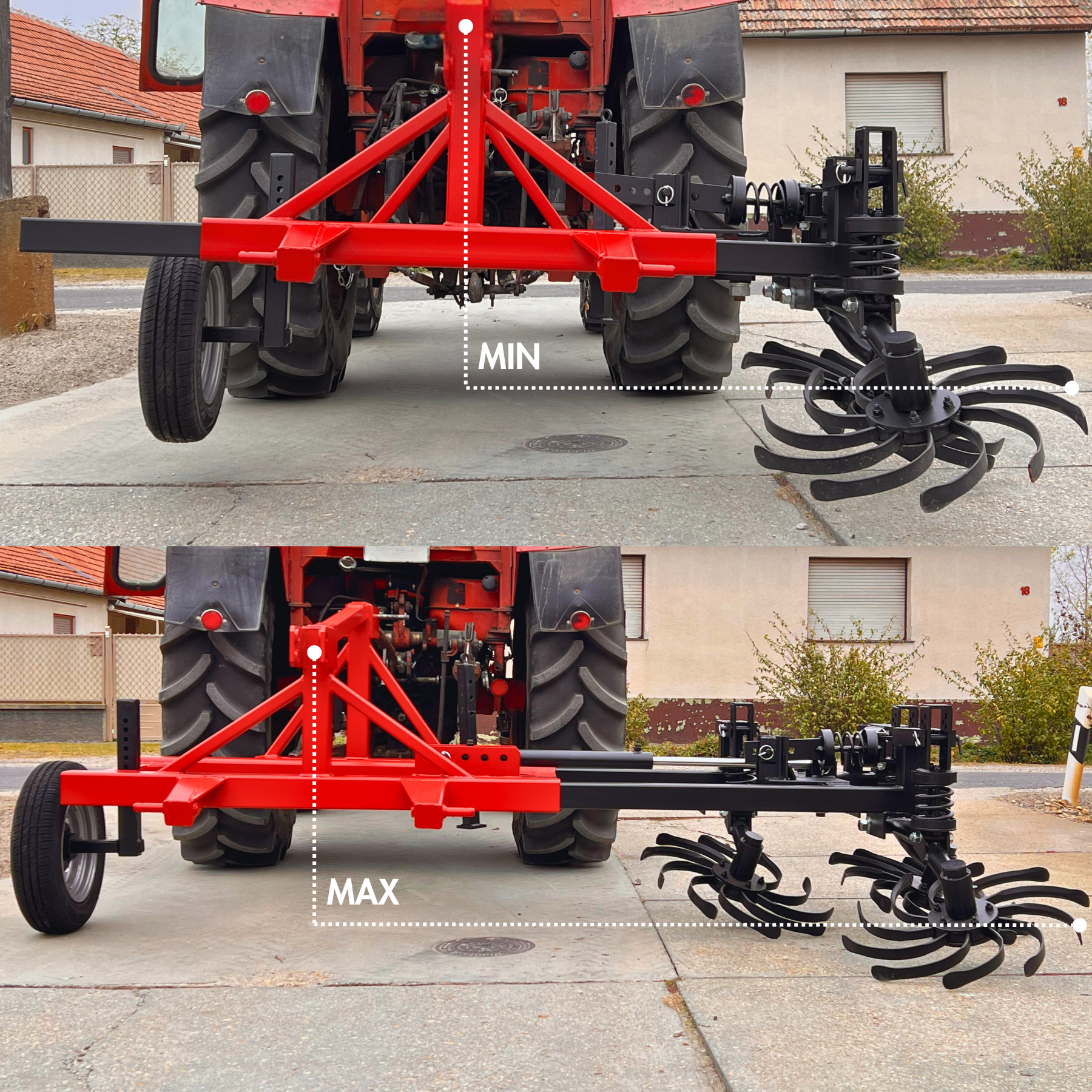 (**) Az extra manuális szélességállítás további 250 mm-rel növeli a forgókapa szélességét a jobb oldalon (7 pozícióban kézzel állítható).